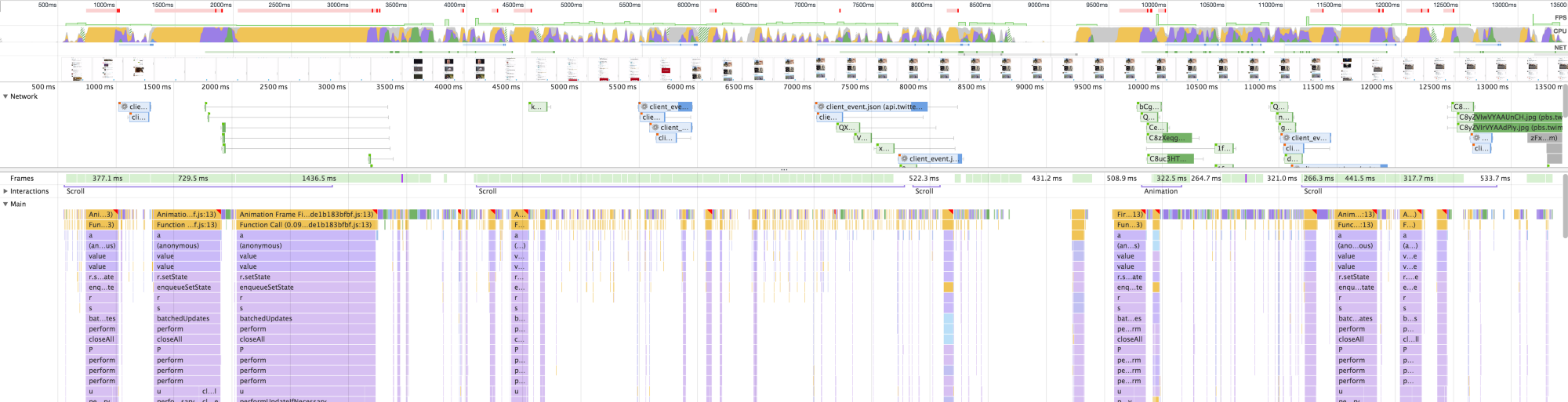 We found that we had a lot of places in our code where we were doing expensive calculations for the sake of analytics during the componentWillMount React lifecycle method. Every time we did this, we blocked rendering of components a little more. 20ms here, 90ms there, it all adds up quickly. Originally, we were trying to record which tweets were being rendered to our data analytics service in componentWillMount, before they were actually rendered (below).